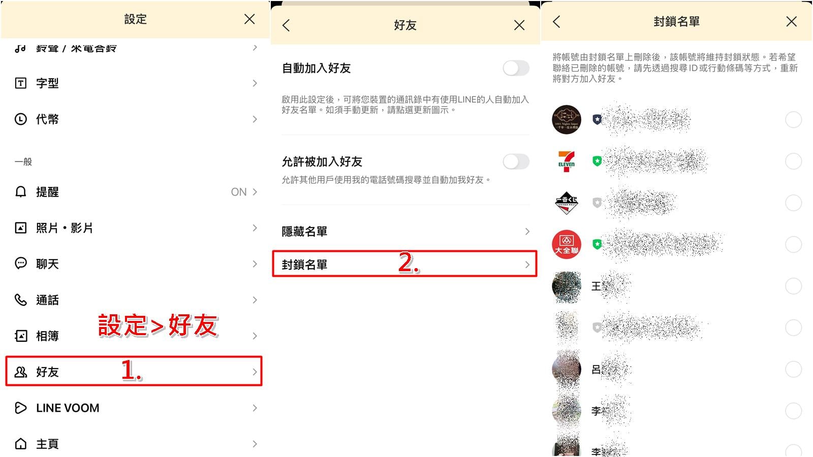進入 LINE「設定」>「好友」>「封鎖名單」
