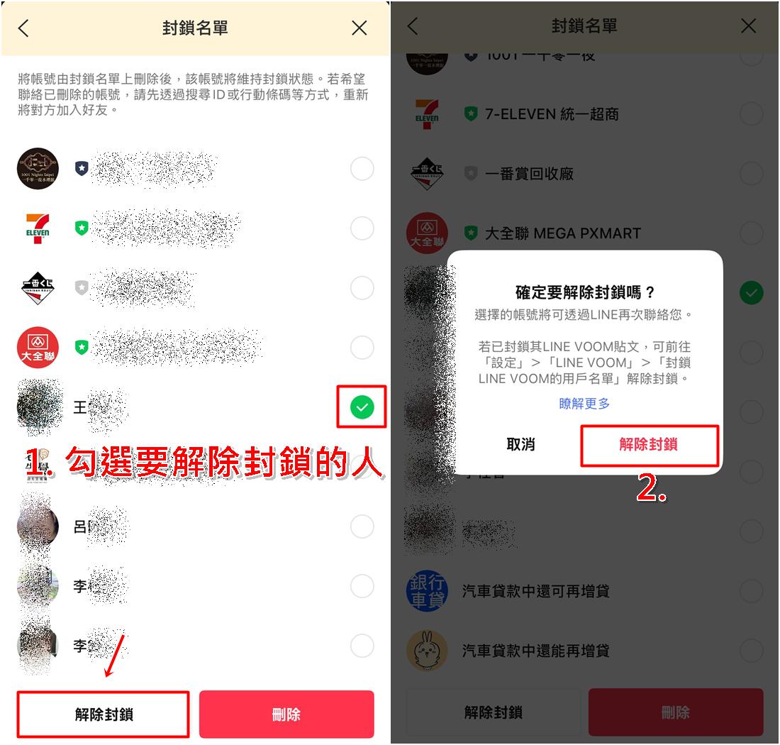 勾選要解除的對象,按下「解除封鎖」並確認即可。