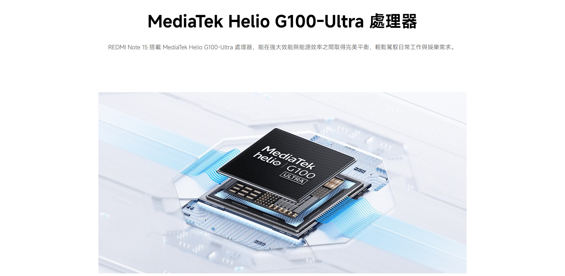 效能方面,紅米 Note 15 4G 採用 MediaTek Helio G100-Ultra 處理器,定位清楚,就是為日常使用而生。它不追求高跑分,而是在穩定度與功耗之間取得平衡。
