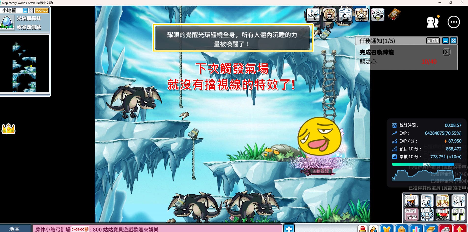 繁中版懷舊楓之谷《楓之谷 Artale》,在2026年1月22日終於開放了職業四轉,同時也帶來一系列活動,讓不少阿泰爾玩家也回歸遊玩!這次當然不乏有練等經驗加倍的活動,之前有玩Artale的玩家都知道,只要擊殺目標怪物達到指定數量,畫面就會跳出一圈又一圈華麗的「氣場特效+文字提醒」,告訴玩家現在正處於經驗加成的狀態,然而氣場動畫特效也讓畫面變得超雜亂,不少人就抱怨「HP、MP、狀態都被擋住了!根本看不清楚畫面」、「這也太擋視線了,角色都看不太到好煩躁!可以關掉氣場特效嗎?」