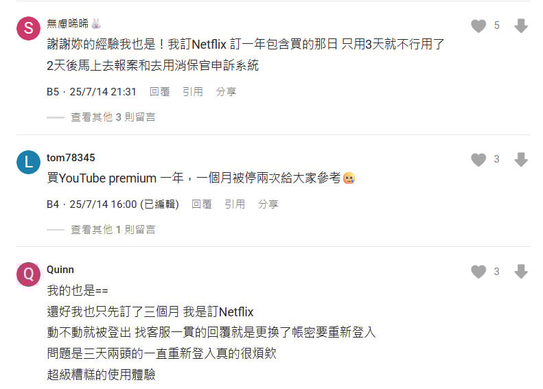 最近有不少網紅推薦「Premlogin」訂閱共享平台,聲稱只要輸入優惠碼,並跟其他擁有帳號的用戶,一起分攤平台的費用,每月就能輕鬆省下幾百元訂閱 Netflix 的開銷。然而這種共享訂閱方式真的安全嗎?有部分網友實際使用「Premlogin」共享訂閱 Netflix 後,抱怨「只用3天就不行用了」、「動不動就被登出,客服一貫的回覆就是:更換了帳密要重新登入。問題是三天兩頭一直重新登入,真的很煩」、「我是Netflix 和gpt 都有買,gpt問題不大,但Netflix三天兩頭就不能看,一下到期、一下要認證、一下要重啟會員…要不然就叫你換帳號,真的煩」……等。雖然大多案例最後都有得到客服回覆處理,不過個人認為,與其省那一點小錢讓自己心情不美麗,倒不如一開始就使用官方訂閱方式,安全方便又不擔心會有資安風險等問題!