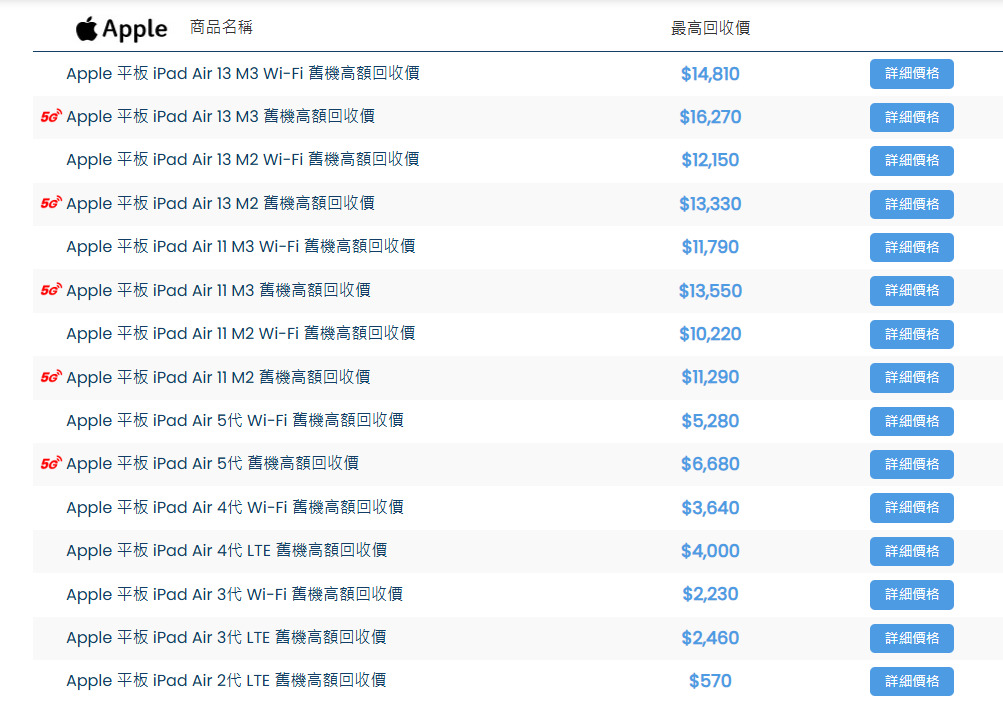 目前傑昇通信已整理出多款熱門 iPad 近期最高回收價,從最新款到較舊機型通通找得到,包含 iPad Pro、iPad Air、iPad 標準版、iPad mini 等系列都在清單內。只要點選右側的「詳細價格」,還能進一步查看不同容量版本的回收價格,幫助你快速判斷手中 iPad 大約值多少錢?估價更有依據!