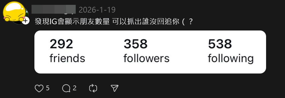 不過另一方面,也有網友表示:「這樣就能快速抓到誰沒跟我互追、或偷退我追蹤了!」XD此外,也有人會問「IG朋友名單能關閉或隱藏嗎?」,答案是「不行」!目前用戶無法自行設定關係或隱藏顯示朋友名單。