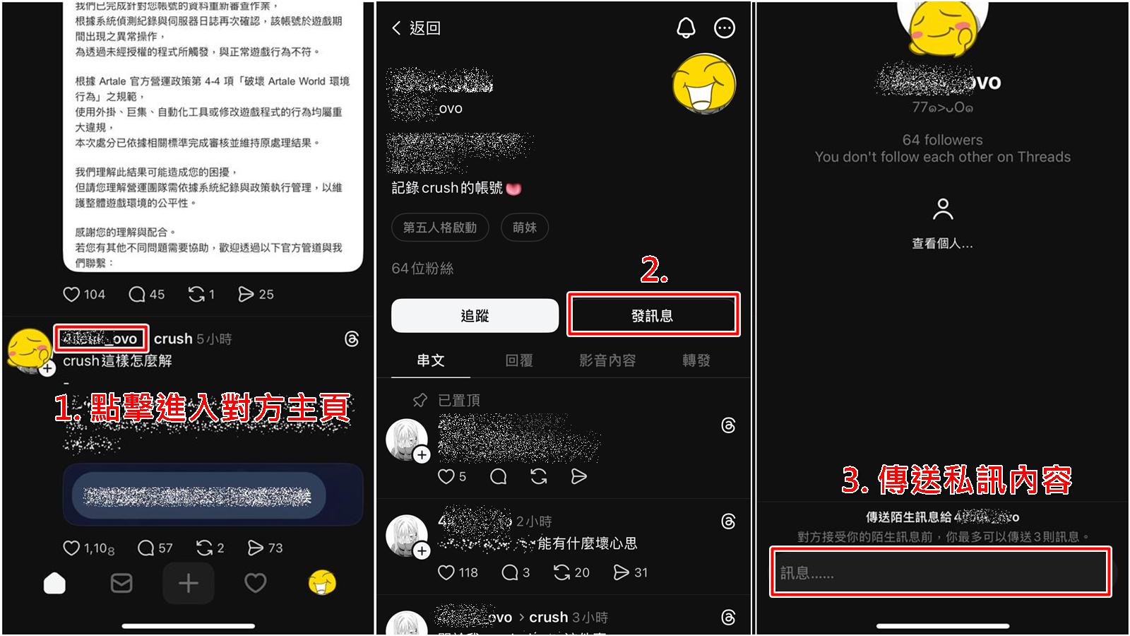如果你是從Threads貼文、留言區或搜尋頁面發現某位用戶,這個方法會更適合你私訊對方。
