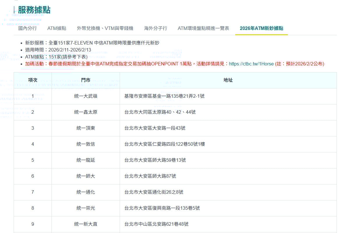而台新銀行則公告從 2/9~2/17日(大年初一),於全台指定的全聯福利中心、新光三越百貨、環球購物中心內,設置 24 小時 ATM新鈔提領服務。