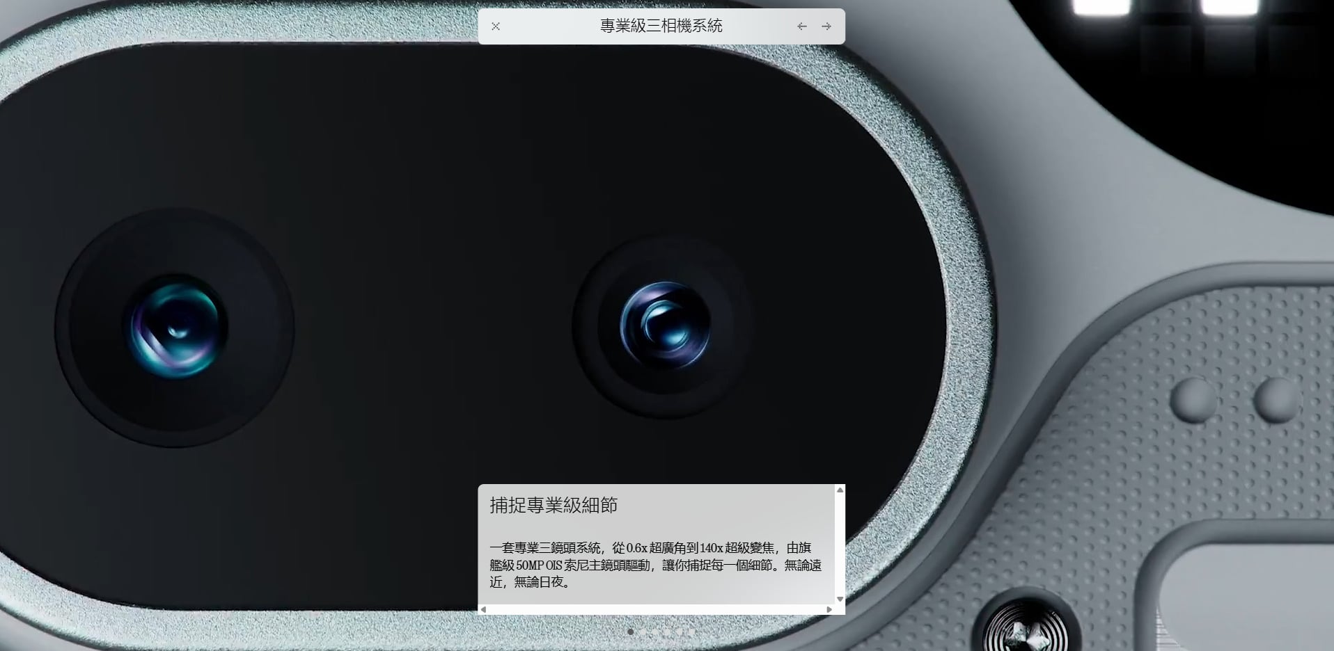 | 後置 相機 | 5000萬畫素OSI主鏡頭 f1.88 5000萬畫素長焦鏡頭 (140倍潛望長焦) f2.88 800萬畫素廣角鏡頭 f2.2 |