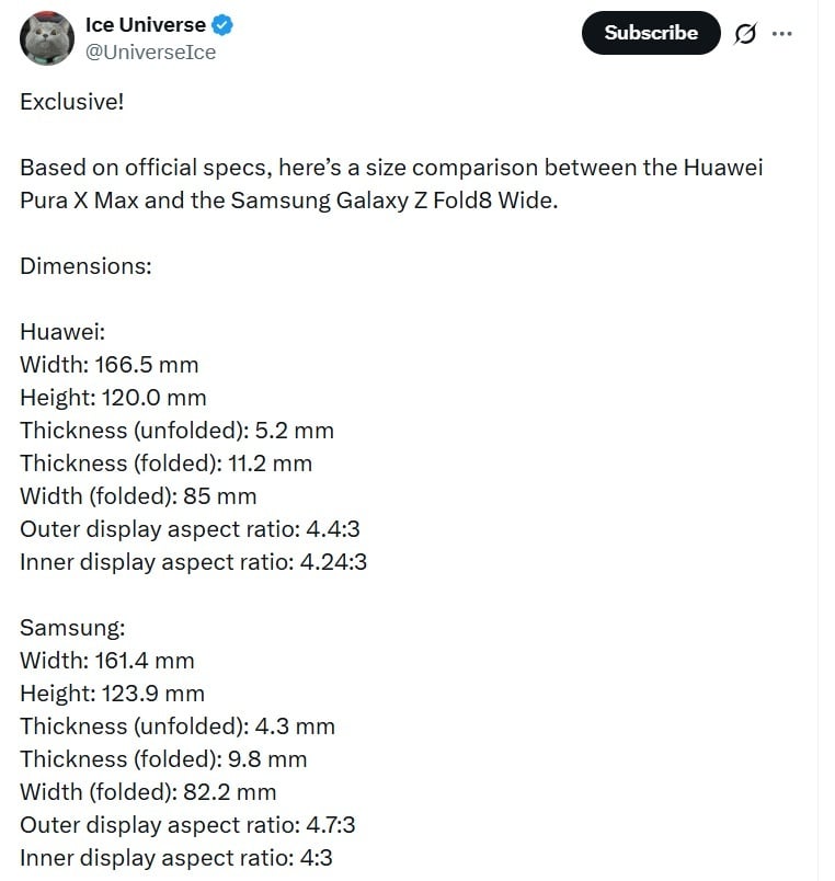爆料者 Ice Universe 也拿它和華為近期推出的 Pura X Max 做比較。兩款手機都主打更寬的摺疊比例,但 Galaxy Z Fold 8 Wide 在厚度上可能更有優勢。爆料稱華為 Pura X Max 摺疊後約 11.2mm、展開後約 5.2mm,相比之下,三星這款 Wide 新機明顯更薄。