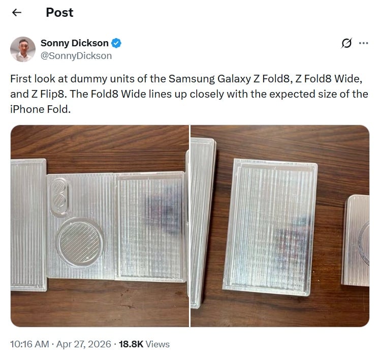 不過,從目前模型機照片來看,Fold Wide 雖然明顯比 Z Fold 8 矮,實際寬度是否真的大幅增加,仍需要等待官方尺寸或實機規格確認。它可能是「比例更寬」,但不一定是「機身大很多」。