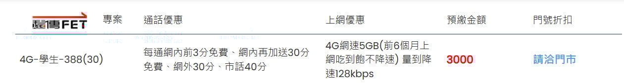 A: 目前最便宜的是月租 388 元的學生專案。此方案享有4G網速5GB,前6個月上網吃到飽不降速,而量到降速128kbps;通話部分包含網內互打前 3 分鐘免費,網內再加送30分免費、網外30分、市話40分等優惠。