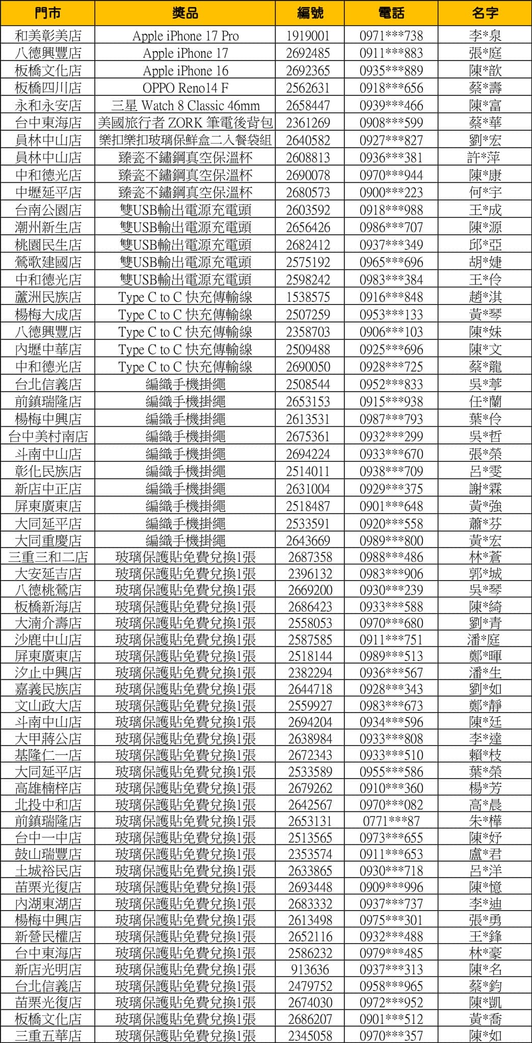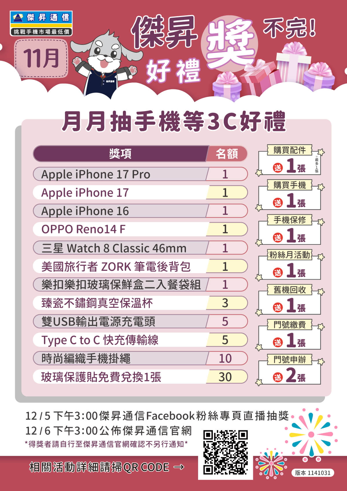 - 以上沒問題【11月月月抽】得獎人請於 114/12/30 (二) 前持對應流水編號存根聯至傑昇通信門市領獎。