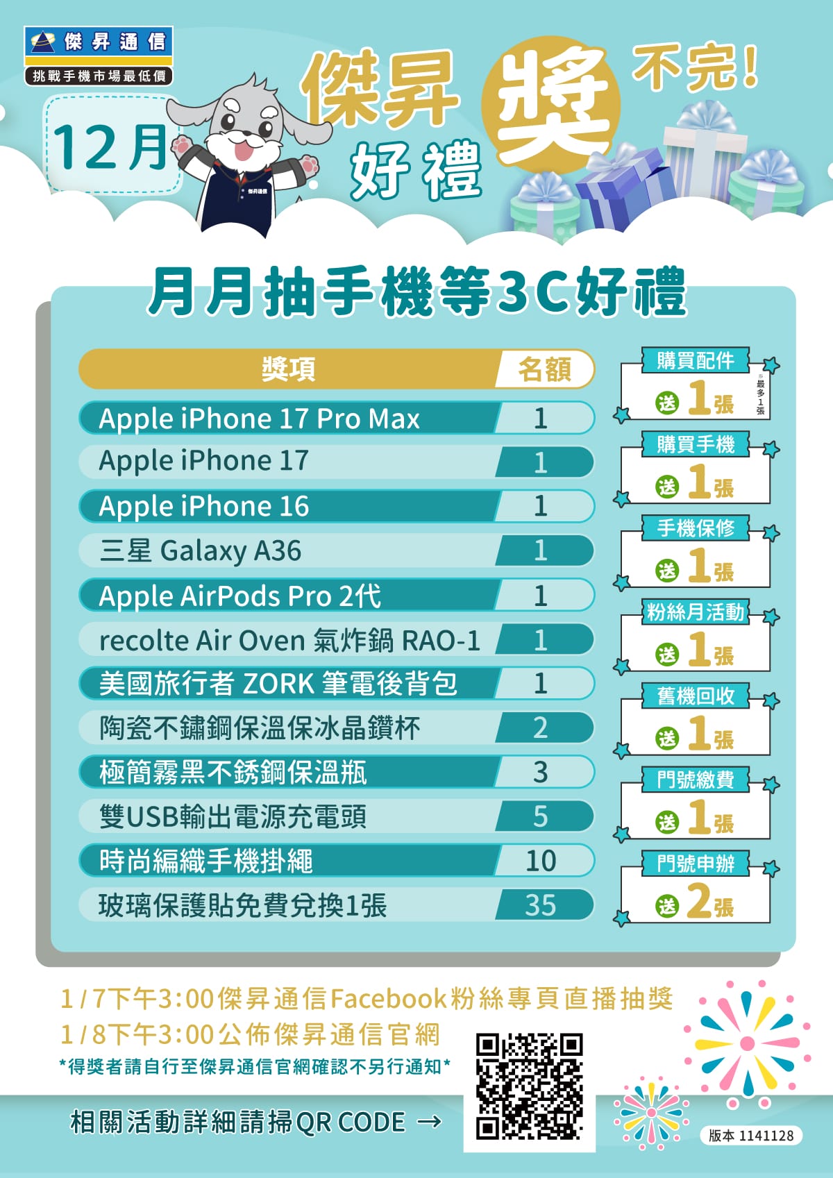 114/12/5 (五) 下午3:00 傑昇通信Facebook總粉絲專頁直播抽出