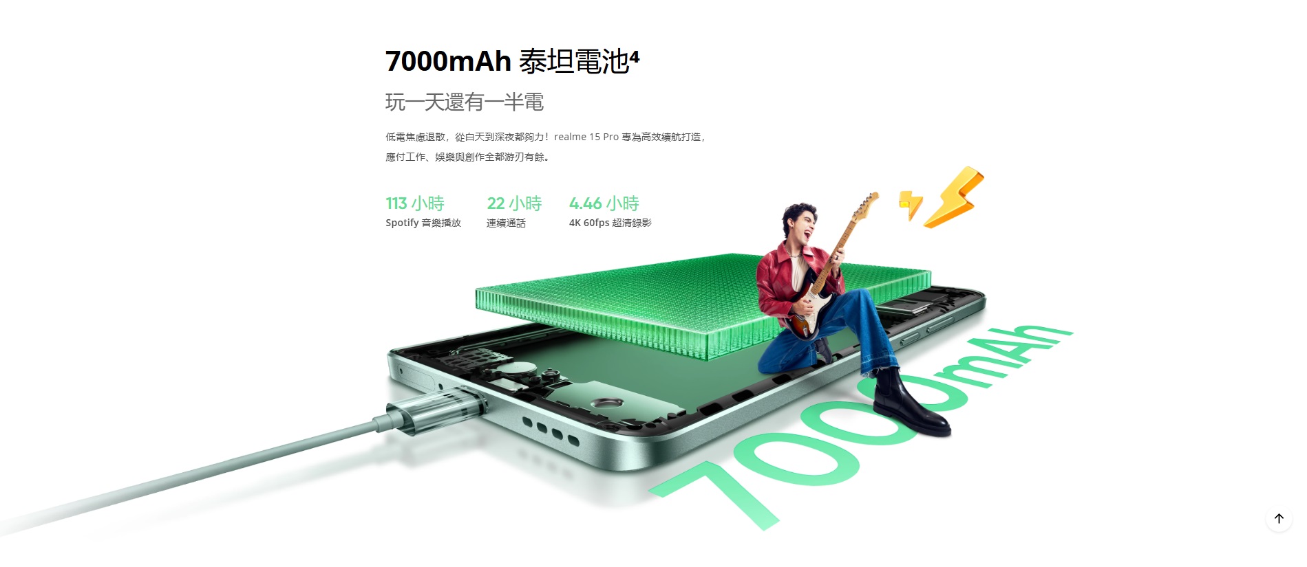 中高階手機realme 15 Pro 5G ,續航部分內建 7,000mAh 電池,支援 80W SUPERVOOC 超級閃充,外出使用更安心!擁有 6.8 吋 1.5K 超清護眼螢幕,支援 144Hz 高更新率,最高亮度達 6,500nits,在戶外陽光下也能清晰顯示,並加入 4,608Hz 高頻 PWM 調光、AI 護眼演算法,能自動調整螢幕色溫與亮度,減少藍光刺激。相機模組搭載雙閃光燈強化夜拍亮度,鏡頭外圈更融入脈衝式通知燈設計,帶來閃爍顯示來電、訊息或提醒,具備 IP69、IP68、IP66 三重防塵防水等級。realme 15 Pro搭配高通S7 Gen 4 處理器,而為了提升遊戲穩定度,採用 7,000mm² 氣流 VC 均熱系統,有效分散熱源,搭配 GT 模式與個人化遊戲設定,帶來更沉浸順暢的體驗。影像部分,realme 15 Pro後置5,000 萬畫素三鏡頭組合,新增「搖動啟動相機」功能,隨時拿起即可開拍,AI 快拍更能一次連拍 50 張,動態影像精準捕捉每個瞬間。相機還導入多項 AI 攝影技術:「AI 派對模式」、「AI 超光影 2.0」、「AI 圖像精靈」等,是一台結合效能、AI 和強大續航力的全能旗艦機!